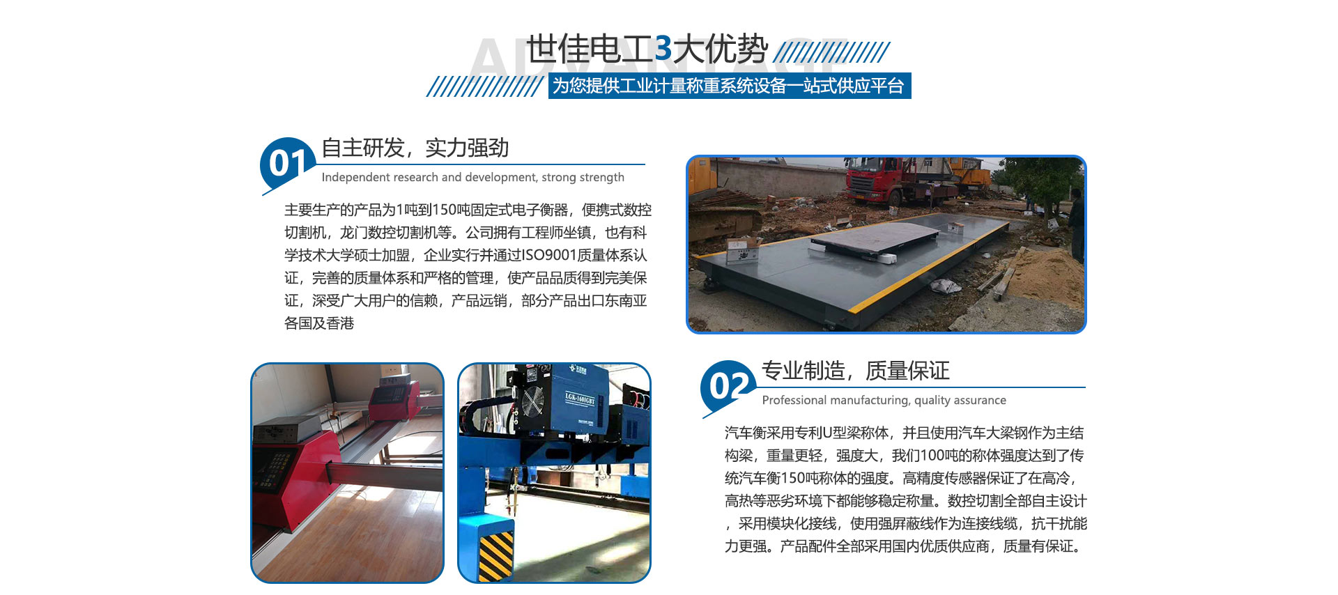 合肥世佳電工設(shè)備有限公司是生產(chǎn)、銷售工業(yè)自動化設(shè)備。主要生產(chǎn)的產(chǎn)品為1噸到150噸固定式電子衡器,便攜式數(shù)控切割機(jī),龍門數(shù)控切割機(jī)等。公司擁有工程師坐鎮(zhèn),也有中國科學(xué)技術(shù)大學(xué)碩士加盟,完善的質(zhì)量體系和嚴(yán)格的管理,使產(chǎn)品品質(zhì)得到保證,深受廣大用戶的信賴,產(chǎn)品各地可售,部分產(chǎn)品出口東南亞各國及香港,數(shù)控切割設(shè)備也在安徽處于前列。我們并不滿足現(xiàn)在所取得的成就,公司繼續(xù)加大科研投入,正在和中科大物理研究所科研人員共同研究開發(fā)下一代衡器控制儀表,希望以技術(shù)作為突破口,將公司做大做強(qiáng),為中華崛起盡自己一份綿薄之力。歡迎廣大客戶來廠參觀訂貨考察。